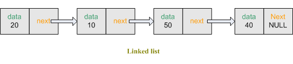Each element (we will call it a node) of a list is comprising of two items - the data and a reference to the next node. The last node has a reference to null. The entry point into a linked list is called the head of the list. It should be noted that head is not a separate node, but the reference to the first node. If the list is empty then the head is a null reference.